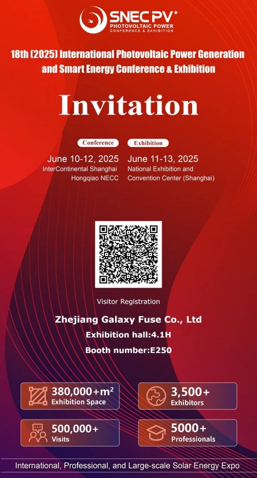 Keywords: SNEC PV+, Photovoltaic Exhibition, New Energy Exhibition, Shanghai Solar Exhibition, Exhibition Preview, Booth Information, Zhejiang Galaxy Fuse Co. Ltd., Fuse, PV Fuse, Smart Energy, Exhibition Invitation, 2025 Exhibition, Shanghai Exhibition.